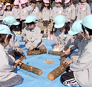 桜の木になめこの菌を打つ園児たち(福岡保育園で)