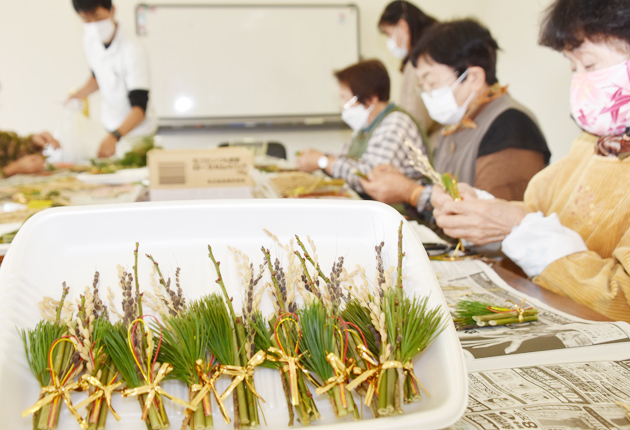 JA愛知東(海野文貴組合長)の「つまもの部会」(浅井友治会長、会員戸数35戸)が28日、新城市長篠の鳳来営農センターで正月の食卓を彩る「箸置き飾り」作りを行った。 「つまもの」は、料理を引き立てるために用いられる葉っぱや枝花の総称で、部会...