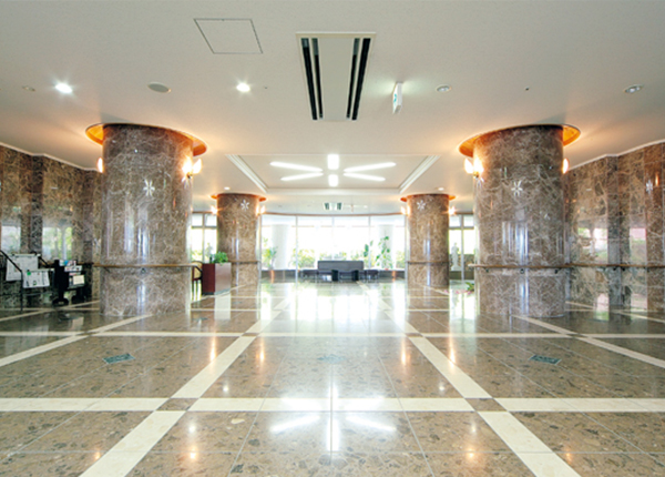 病床数は全411床。医療保険対象の「療養型病床」、回復し退院を目指す「回復期リハビリテーション病棟」、そして医療と生活を支える「介護医療院」の3つを柱に、一人一人の状態や人生に寄り添った支援を行っています。山の傾斜を生かしたゆとりある院内は、広々とした設計で明るく開放的。大理石ふんだんのロビーや市内を一望できる食堂など、快適な療養環境も整えています。